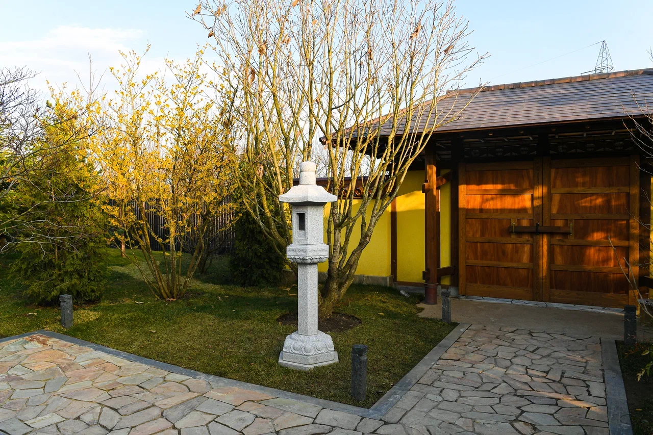 Ворота, служащие выходом из сада, выполнены в стиле сукия-дзукури. Этот вид японской архитектуры возник в XVI веке. Он свободен от строгой архитектурной формальности. По этой причине важно, чтобы ворота излучали тонкое чувство и гармонировали с окружающей средой.